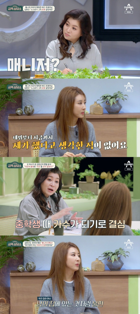 이날 오은영은 자기 자신에 부정적인 김완선에 "어디서부터 그런 마음이 출발하게 되었는지"라고 물었다. 김완선은 "이일을 시작할 때 음악이 너무 좋아서 시작을 했다. 그런데 매니저였던 분이 너무 훌륭한 분이셨는데 전 너무 어렸고 이모가 시키는 대로 한 로봇 같은 존재였다"라고 털어놨다. 김완선은 "제 마음속에서 저는 데뷔했을 때부터 단 한 번도 제가 했다고 생각해 본 적 없다. 보람을 느끼며 일을 하지 못했다"로 전했다.