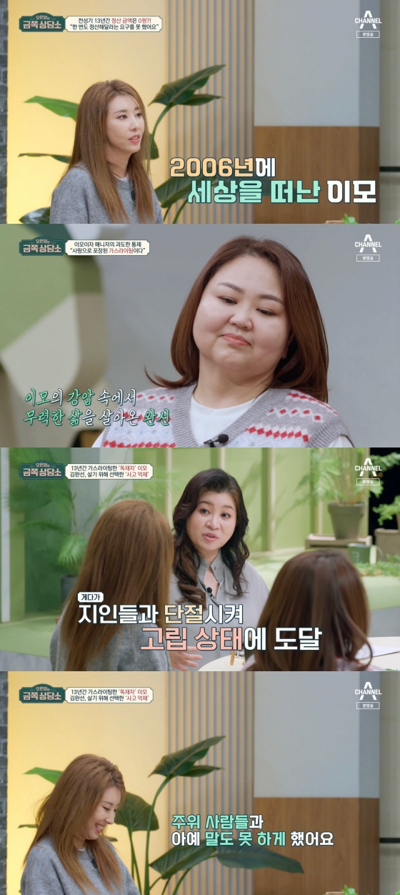 김완선은 "새벽부터 일을 하는데도 받은 돈이 없었다. 13년 동안 받은 게 없다. 그래도 단 한 번도 '왜 정산 안 해줘요?'라고 해본 적이 없다"고 말했다. 김완선의 동생 김영선은 "이모가 엄마한테는 통장을 보여주고 안심시켰다. 근데 그 돈을 이모가 찾아갔다"고 폭로해 충격을 안겼다. 오은영은 "이모는 그 많이 버신 돈 어떻게 하셨냐"라고 물었다. 김완선은 "이모의 남편이 다 가져다 썼다"고 말했다. 정형돈은 "이모님하고 관계는 어떻냐"고 물었다. 김완선은 "2006년에 돌아가셨다"고 알렸다. 오은영은 "이모의 통제 아래 철저하게 고립됐고 주변 상황을 통해 지배력을 강화했다. 명백한 심리적 지배이다"며 심각성을 전했다.