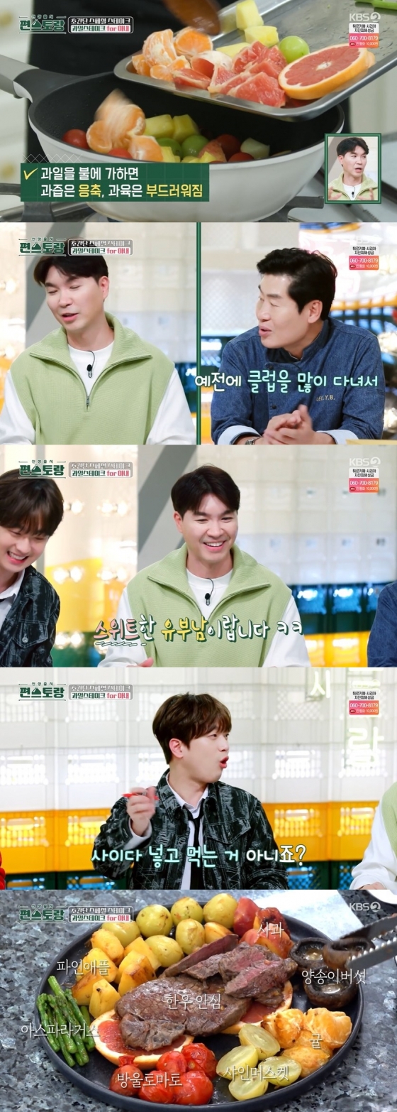 이어 박수홍은 손질한 과일을 기름 두른 펜에 센 불로 볶았고, 한우 안심을 과즙이 남은 팬에 서 구웠다. 박수홍은 스테이크와 과일의 만남으로 육즙과 과일즙을 섞은 천연 소스 '과일 스테이크'를 선보여 감탄을 자아냈다.