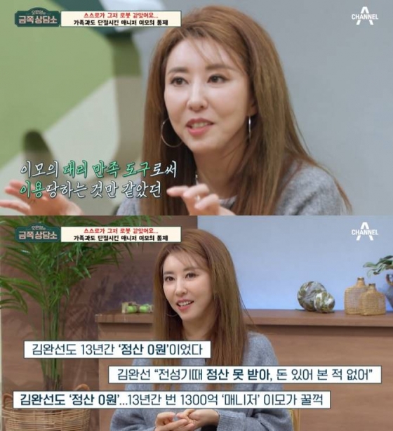 김완선은 "새벽부터 일을 하는데도 받은 돈이 없었다. 13년 동안 받은 게 없다. 그래도 단 한 번도 '왜 정산 안 해줘요?'라고 해본 적이 없다"고 밝혔다. 김완선의 동생 김영선은 "이모가 엄마한테는 통장을 보여주고 안심시켰다. 근데 그 돈을 이모가 찾아갔다"고 폭로해 충격을 안겼다.
