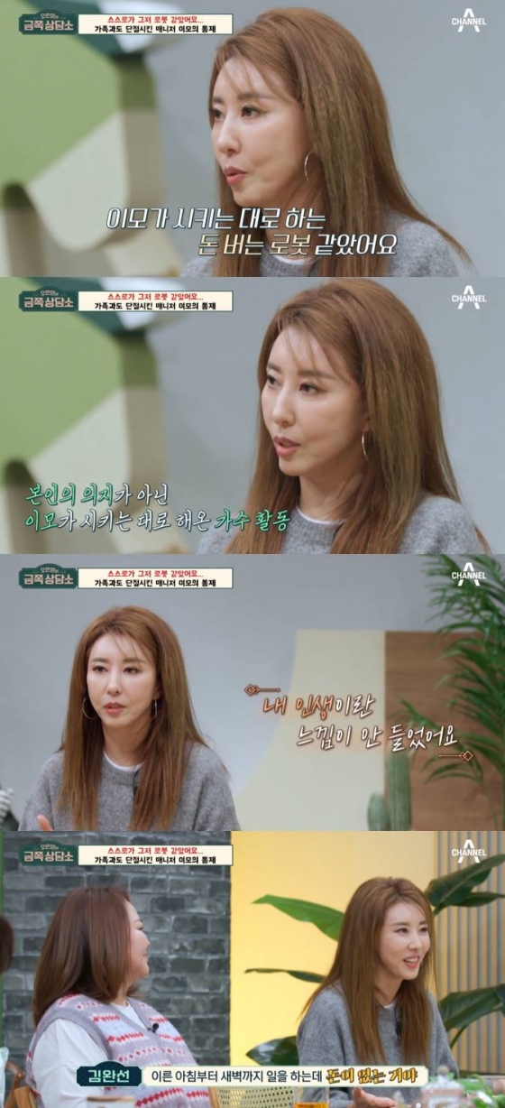 김완선은 "이 일을 시작할 때 음악이 너무 좋아서 시작을 했다. 매니저였던 이모가 내 트레이닝과 프로듀싱을 맡았고 너무 훌륭한 분이셨는데, 난 너무 어렸고 이모가 시키는 대로 한 로봇 같은 존재였다"라고 털어놨다.