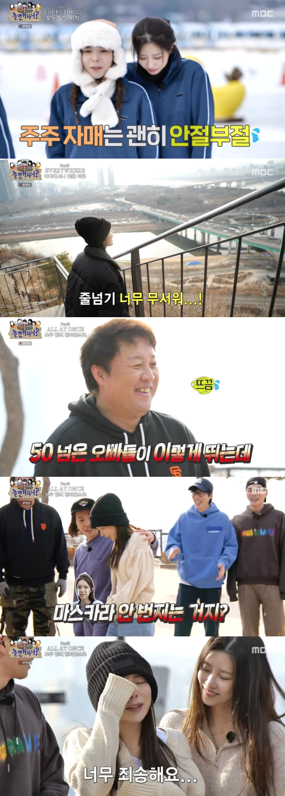 제일 먼저 도착한 것은 박진주였다. 박진주는 멋진 응봉산 뷰를 내려다보며 "줄넘기 너무 무섭다. 태어나서 줄넘기 때문에 이렇게 무서워할 거라고는 생각도 못 했다"고 포효해 폭소를 자아냈다. 이어 유재석이 도착했고, 이이경은 이미주를 위한 토스트와 멤버들을 위한 에너지 드링크까지 손에 든 채 등장해 훈훈함을 안겼다. 또 민낯으로 도착한 이미주는 "누가 응모했냐"며 괴로워해 웃음을 더했다.