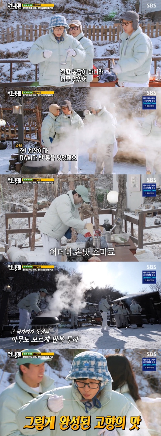 그러나 하하가 지석진에게 "형, 세찬이가 조미료 반 통 넣었대요"라고 말하며 깊은 육수의 비결이 탄로나 게 됐고, 몰래 큰 국자로 조미료를 떠서 반복적으로 수제비에 넣는 양세찬의 행동은 보는 이들로 하여금 웃음을 자아냈다.