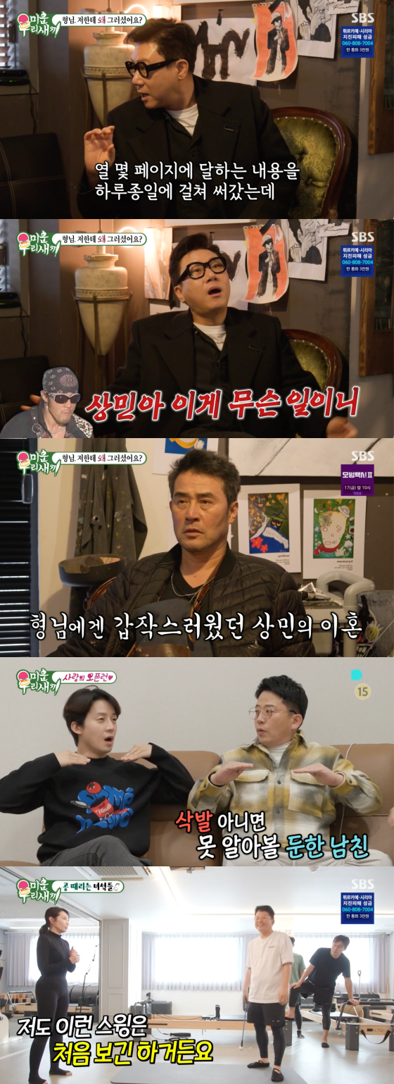 최민수는 웃으며 "그냥 지나는 길이었다. 이혼한다는 것도 거기서 들었다"고 설명했고, 이상민은 "당사자인 나보다도 먼저 도착했다"고 덧붙여 폭소를 자아냈다. 이상민은 이에 "오해를 풀어야 하는 자리라 열 몇 페이지에 달하는 내용을 하루종일 써갔는데 갔더니 형님이 내가 앉아야 할 자리에 앉아 '상민아 이게 무슨 일이니'라 말했다. 머리가 하얘졌다"고 당시 상황을 설명해 웃음을 더했다.
