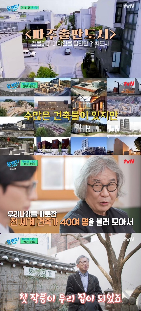 이후 승효상은 '파주 출판 도시'에 대해 이야기했다. 승효상은 "건축은 보통 자본과 권력에 의해 만들어지는데 출판인과 건축가가 만나 문화로 만든 작은 도시다. 우리나라에서 이런 형식은 최초일 거다. 전 세계 건축가 40명을 모았다"고 설명했다.