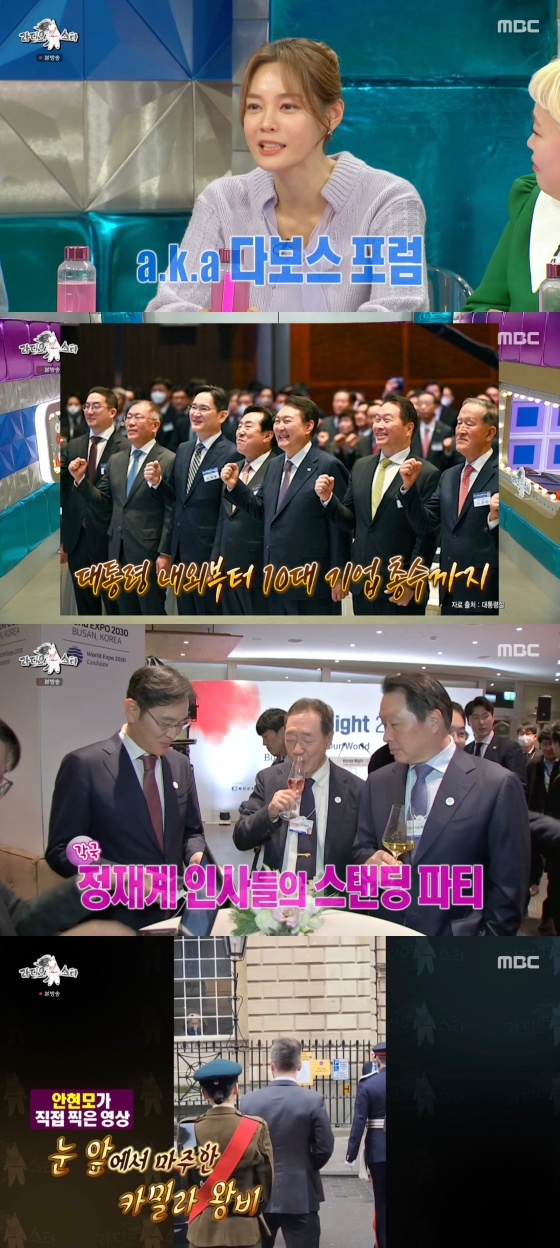 안현모는 "우리나라에서 '한국의 밤'을 개최를 해 진행했다. 각국 정재계 인사가 총출동했다. 다보스는 작은 마을이라 80평 정도의 작은 행사장에 350명이 어깨가 부딪힐 정도더라. 스탠딩 파티를 했다. 그냥 아무렇지 않게 명함도 주시고 다들 친근하게 대해주시더라"라고 전했다. 안현모는 "운이 좋았던 게 런던 옆에 바스라는 도시가 있다. 갔다가 왕비를 만났다. 호텔에서 나와 구경하려고 했는데 경호가 삼엄했다. 카밀라 왕비가 왔다고 했다. 제 바로 앞까지 오셨다"며 신기해했다.
