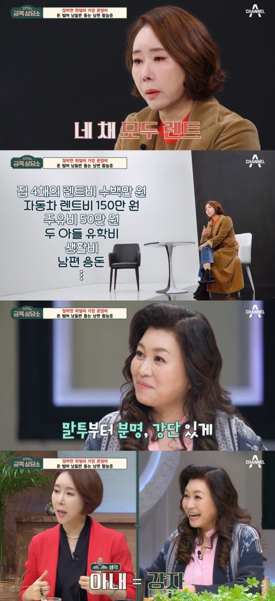 17일 방송된 채널A '금쪽 상담소'에는 윤영미, 황능준 부부가 출연했다. 윤영미는 20년째 외벌이를 하고 있다며 경제 활동을 하지 않는 남편 황능준에 대한 고민을 털어놨다.