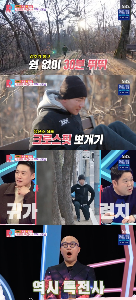 이날 박군의 아침 루틴이 공개됐다. 박군은 오전 6시에 기상해 잠자리를 정리했다. 이후 박군은 영하 17도의 날씨에 러닝을 즐겼다. 박군은 공원에서 크로스핏, 마운틴 클라이밍 등 열심히 운동했다.