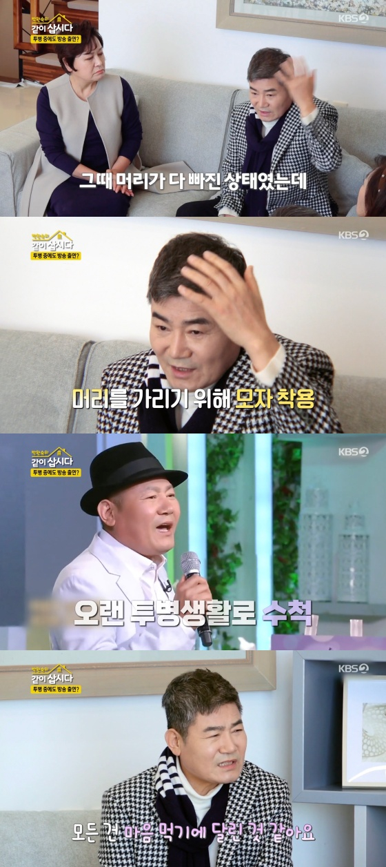 이날 진성은 아팠던 과거를 털어놨다. 진성은 "투병생활은 6개월 정도 치료받았다. 방송국에서 아픈 것에 대해 프로그램을 해보자 했다. 제가 걷지도 잘 못했다. 근육이 퇴화해 걷기가 힘들더라. 방송국에서 찍자 하니까 마음을 뺏겨 5개월 만에 방송 출연했다"고 전했다. 진성은 "그때 머리가 다 빠진 상태였다. 모자를 하나 사서 쓰고 나가서 아침에 걷지 못할까 봐 걱정했는데 마음가짐이 그래서 그런지 방송국까지 가서 방송했다"고 전했다.