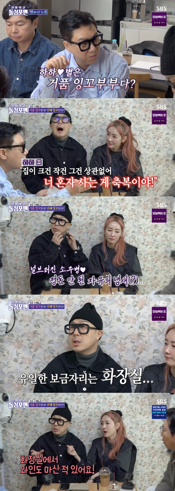 이날 MC 이상민은 하하 별 부부에 "'거품 잉꼬부부다'라는 소문이 있다"라고 물었다. 이상민은 "첫 번째 증거 하하가 싱글 후배를 부러워한다. '집이 크건 작건 그건 상관없어. 너 혼자 사는 게 축복이야'라고 했다"고 전했다. 하하는 "걔가 되게 자유롭게 느껴졌다. 널브러진 소주 병, 정돈 안된 자유의 냄새에 '오 여기가 천국인가' 했다"고 전했다.
