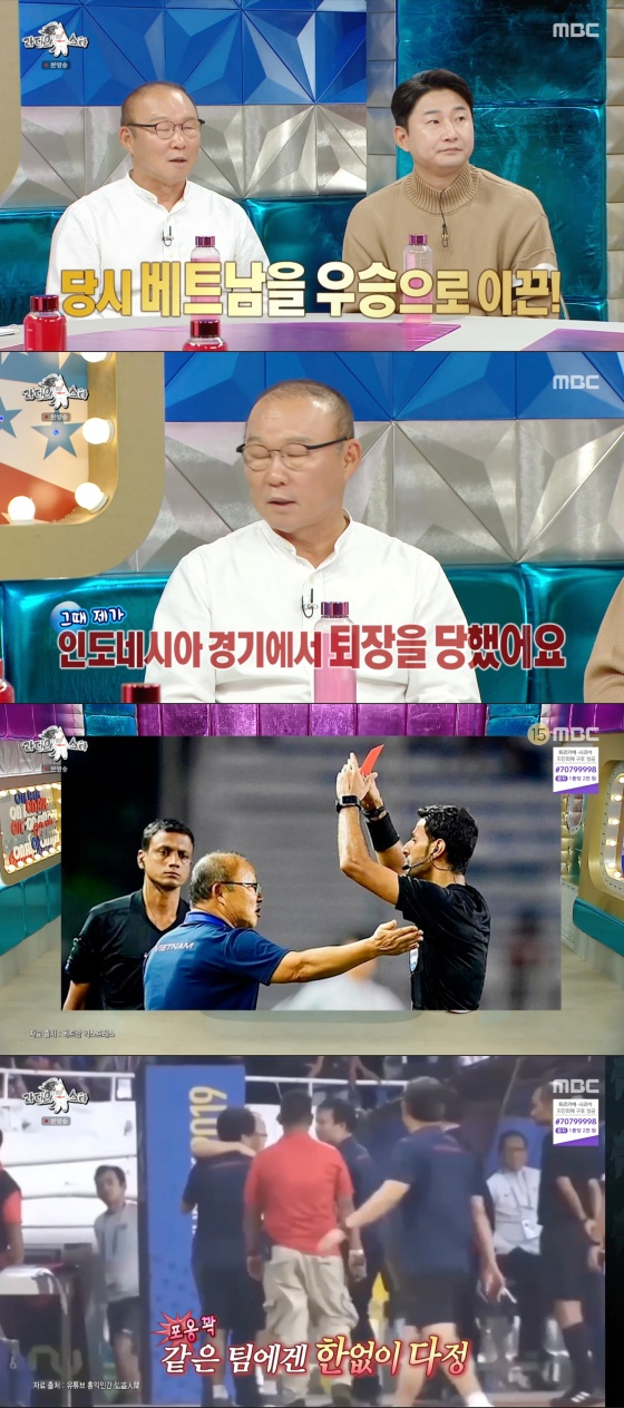 이후 박항서는 "2019년 열린 동남 아시안게임 대회 60년 이래 우승한 적이 없는데 제가 우승했다"라고 자랑했다. 박항서는 "인도네시아 경기에서 퇴장당했다. 인도네시아가 가격한 플레이를 해서 '감독이 나서주면 선수에게 큰 힘이 되지 않을까' 싶어서 심판한테 어필 정도 하려고 했는데 레드카드를 받았다. 우리 선수들이 그만하라고 했다"고 전했다. 박항서는 "제가 그렇게 하니까 베트남 국민들이 '어미 닭이 병아리를 보호하려는 것 같다'라는 표현을 하더라"라고 덧붙였다.