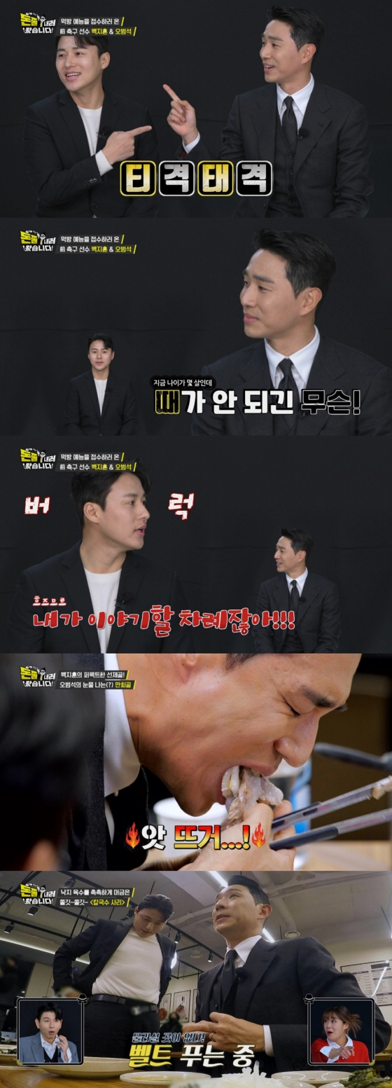 이날 스페셜 먹요원으로 등장한 전 국가대표 축구선수 백지훈, 오범석은 '30년 지기'답게 시종일관 서로를 타박해 웃음을 자아낸다.