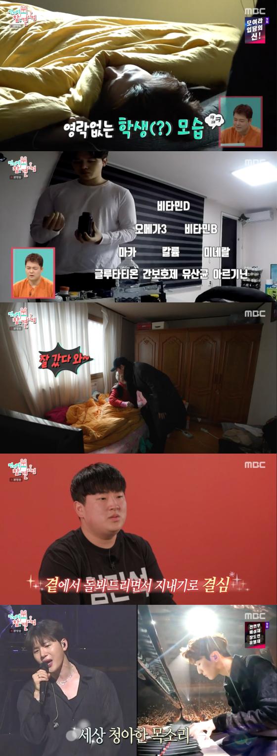 그러나 김민석은 대학생들의 자취방을 연상시키는 친근한 원룸에서 눈을 떠 놀라움을 자아냈다. 출연자들은 이에 "우리가 예상하던 모습과 다르다", "하얀 침대에서 깨어날 줄 알았다"며 김민석의 소박한 생활에 감탄했다. 김민석이 눈 뜨자마자 가장 먼저 한 일은 영양제를 털어넣는 일이었다. 매니저는 김민석이 평소 글루타티온, 간 보호제, 아르기닌, 마카 등 총 10가지의 영양제를 먹는다 밝혀 놀라움을 안겼다.