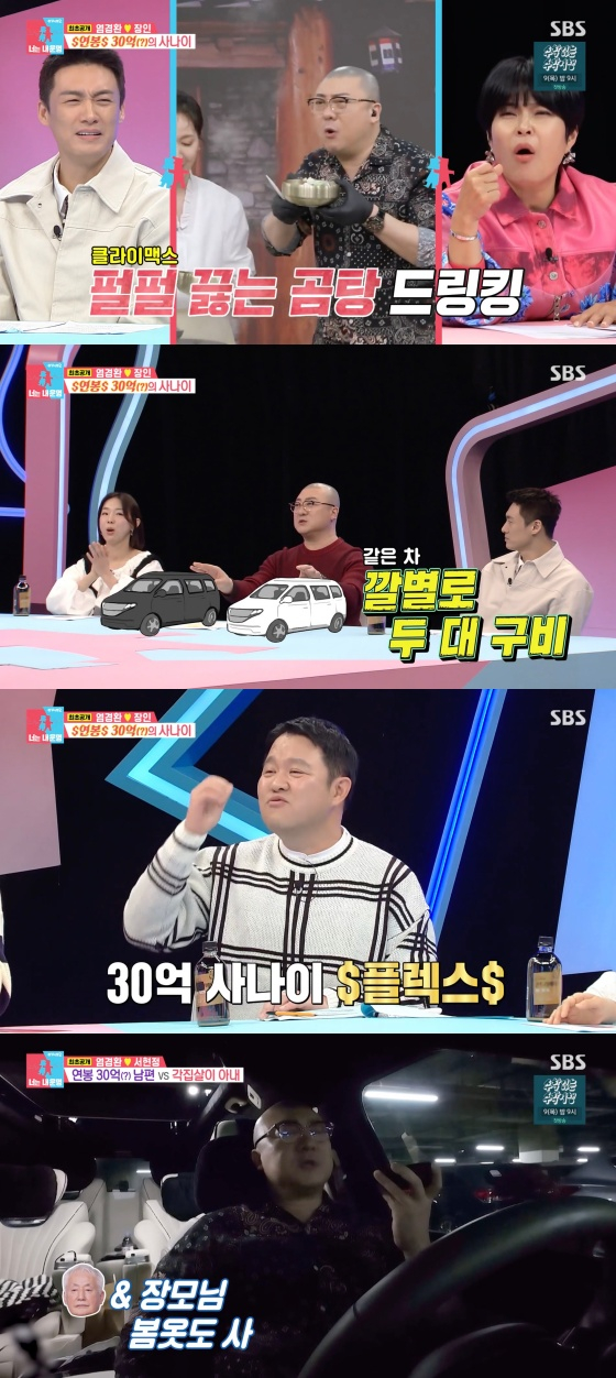 이날 MC 김숙은 하루 종일 이동하는 염경환에 "일 년에 몇만 정도 타냐"라고 물었다. 염경환은 "차를 두 대 돌려탄다. 한대 타다가 시동 안 걸리면 큰일 나니까 똑같은 차를 색만 다르게 두 대 구비하고 있다"고 밝혔다. MC 김구라는 "P사 스포츠카를 탔는데 아내가 너무 타고 다녀서 '그럼 너도 하나 사줄게'라고 해서 아내도 사줬다"고 밝혀 놀라움을 안겼다.