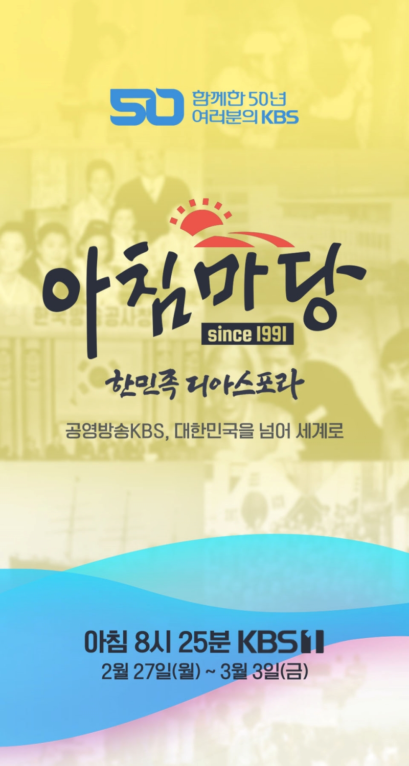 28일 KBS에 따르면 '아침마당'은 세계에 흩어진 '한민족 디아스포라(해외 정착 재외 동포)'의 발자취(하와이 이민 120주년/파독광부 60주년/정전 70주년)를 더듬어 보고, 한민족 문화의 중심이자 근간인 KBS의 역할을 재조명한다.