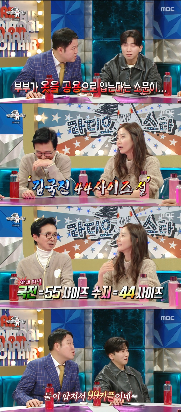 이어 김구라는 강수지에게 "부부가 옷을 공용으로 입는다는 소문이 있다"라며 김국진이 실제로 44사이즈를 입는 게 맞냐고 물었다. 이에 강수지는 "아니다. 남편 55는 사야 된다. 제가 44사이즈 입는다"라고 정정했다. 이에 김구라는 "둘이 합쳐서 99 커플이네"라고 해 모두를 폭소케했다.