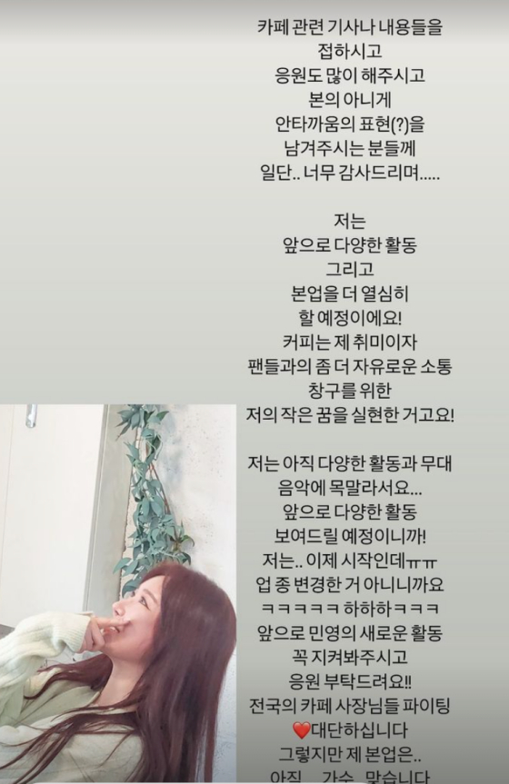 민영은 4일 자신의 인스타그램 스토리에 "카페 관련 기사나 내용들을 접하시고 응원도 많이 해주시고 본의 아니게 안타까움의 표현을 남겨주시는 분들께"로 시작하는 긴 글과 함께 사진 한 장을 게시했다.