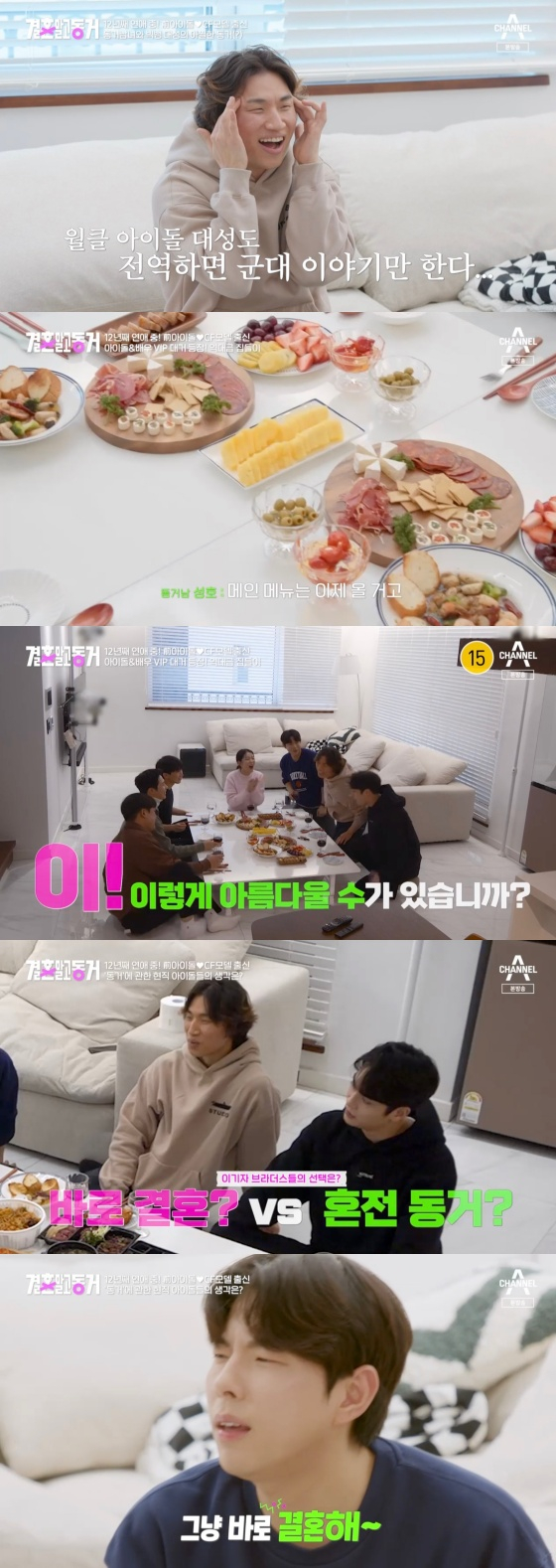 6일 오후 방송된 채널A 동거 관찰 러브스토리 '결혼 말고 동거'에는 빅뱅 대성, 비투비 은광, B1A4 신우, 배우 조윤우, 김선우가 12년 차 장기 연애 커플 성호, 상미의 동거 하우스에 방문했다.