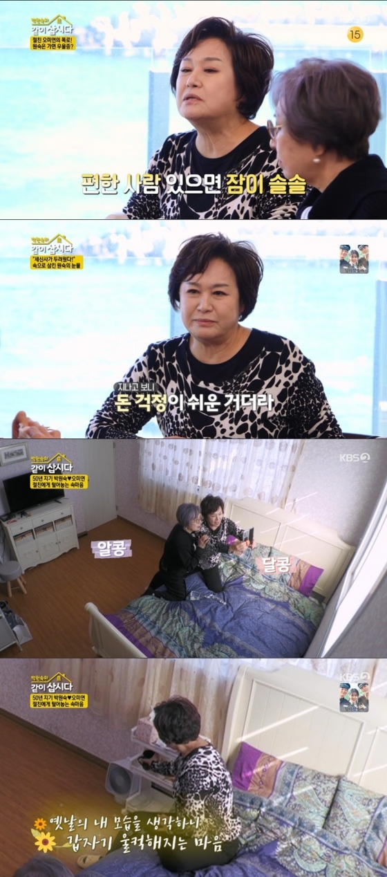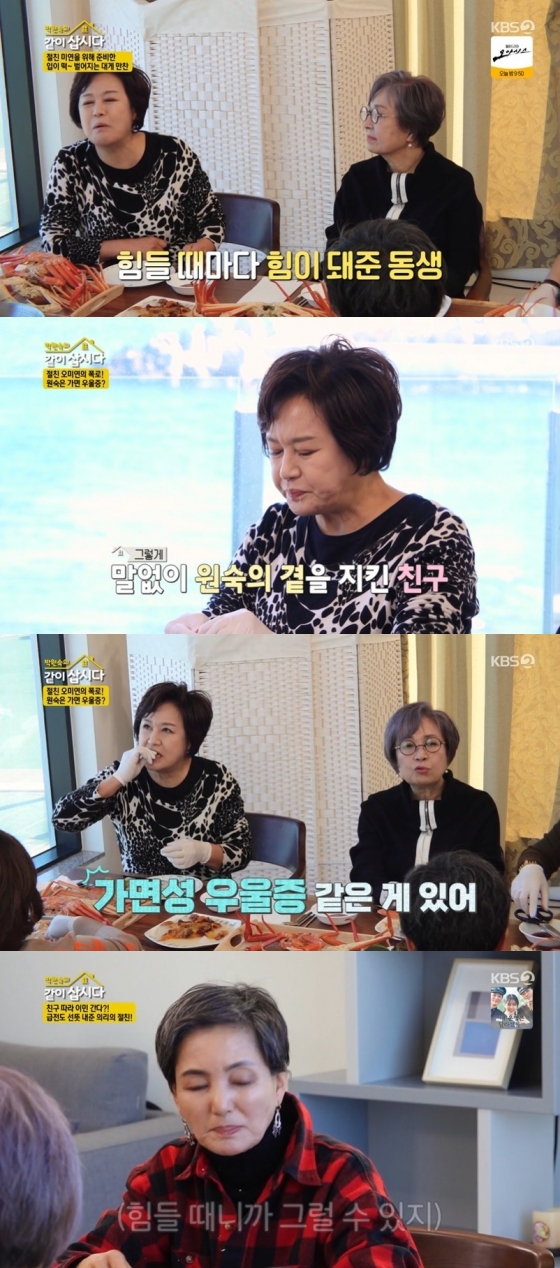오랜 시간 함께 해온 절친답게 오미연은 박원숙이 힘들었을 때의 일화를 공개했다. 오미연은 "언니가 행복하고 즐거워 보이지만 나는 속을 아니까. 약간 가면성 우울증 같은 게 있어"라며 말을 꺼냈다. 이어 "남들한테는 즐겁게 해줘. 근데 헤어지고 나서는 우울해지는 거야"라며 박원숙의 힘들었던 과거를 밝혔다.