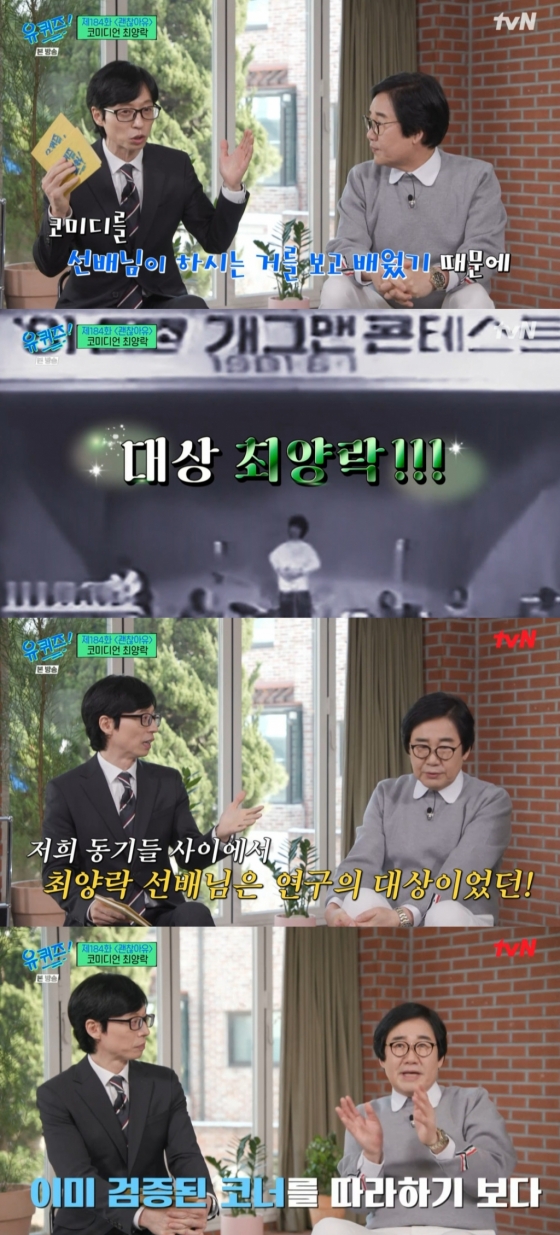이어 "제가 91년도에 KBS에 들어갔을 때 '괜찮아유' 코너를 하고 계셨는데 옆에서 보면서 많은 공부가 됐다. 우선 아이디어가 놀라웠다. 너무 웃겨서 저희 동기들 사이에서 최양락 선배님은 연구의 대상이었다"고 설명했다.