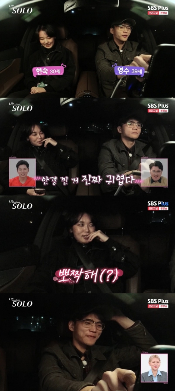 두 사람은 차를 타고 데이트 장소로 향하며 대화를 나눴다. 현숙은 "안경 낀 거 진짜 귀엽다. 좀 쳐다보고 있을게. 뽀짝해"라며 데이트 장소에 도착하기 전부터 '플러팅 고수'다운 멘트를 이어갔다.
