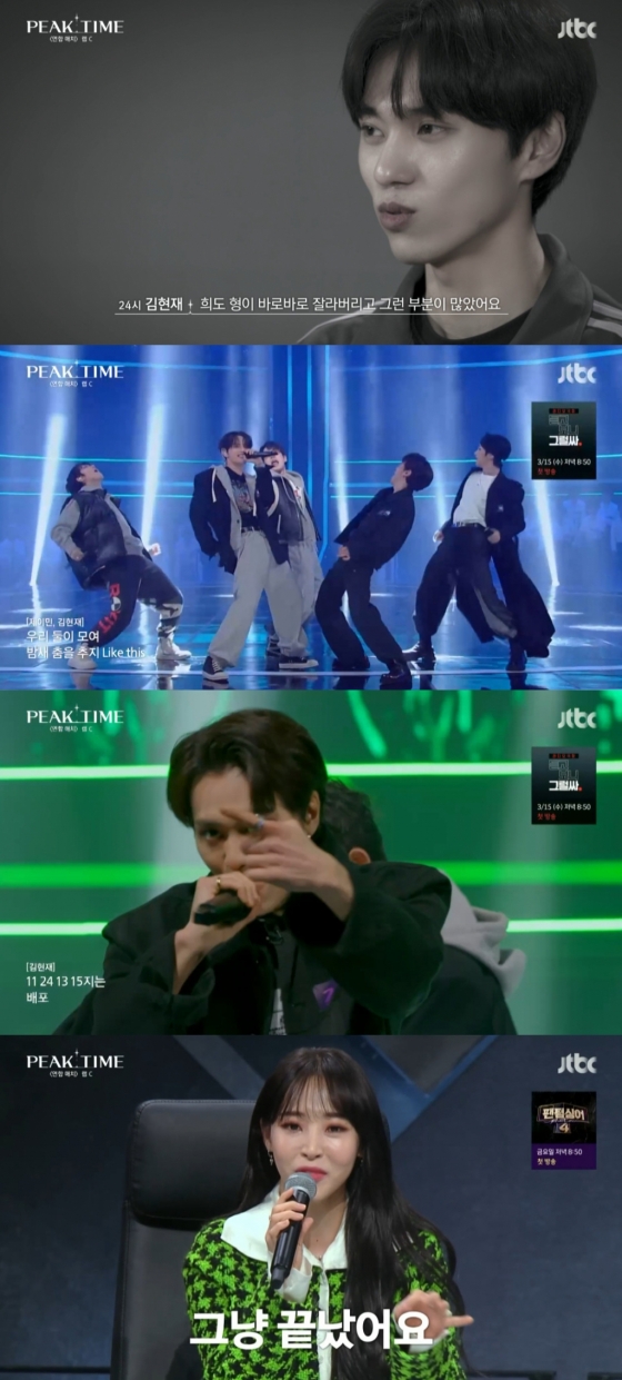 8일 방송된 JTBC '피크타임'에서는 C팀의 랩 유닛이 등장해 무대를 펼쳤다. 해당 무대에는 앞서 '학폭' 의혹에 휩싸인 김현재가 포함돼 있었고, 의혹 이후에도 편집 없이 등장해 눈길을 끌었다.