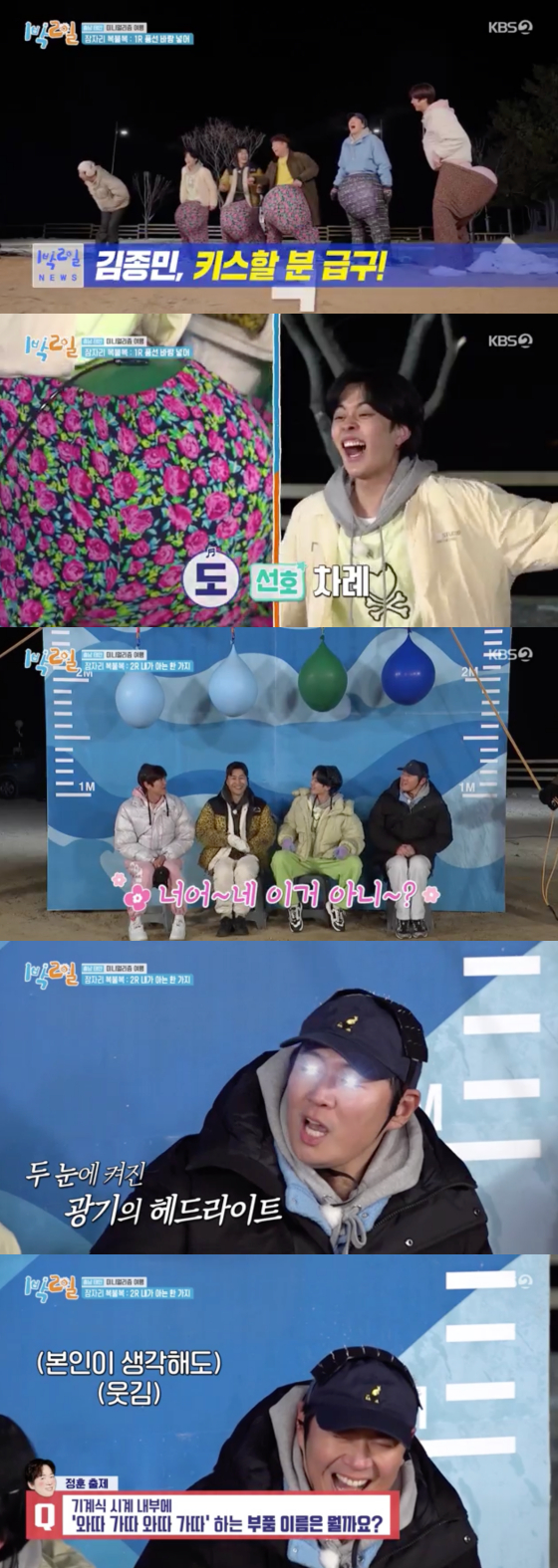 이날 멤버들은 잠자리 복불복을 위해 바지 속 풍선을 터뜨리는 '손병호 게임'을 진행했다. 앞선 맹공격에 발끈한 문세윤은 "주위에 키스할 여성이 없는 사람"이라며 미혼 멤버들을 저격해 폭소를 자아냈다. 그러나 김종민은 이에 "있다"고 답해 멤버들을 깜짝 놀라게 했다. 멤버들은 김종민의 '그녀'를 알기 위해 질문을 퍼부었으나, 김종민은 "여기서 물어봐야지"라 답해 현장을 웃음바다로 만들었다.