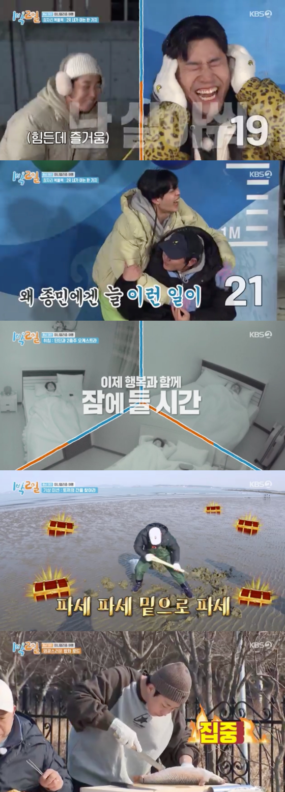 다음 날 아침 준비된 기상 미션은 실내 취침과 야외 취침 팀으로 나뉘어 각자 개불과 숭어를 잡아오는 미션이었다. 16년차 관록의 김종민은 훨씬 유리한 숭어를 선택하며 손쉽게 아침 식사를 획득했다. 하지만 나인우, 문세윤은 실내 팀의 승전 소식을 듣고도 개불 잡기를 포기하지 않으며 단합을 선보였고, 제작진의 환심을 사 아침 식사를 얻게 됐다. 먼저 포기한 딘딘은 잔뜩 삐친 채 홀로 숭어를 구워 웃음을 안겼다.