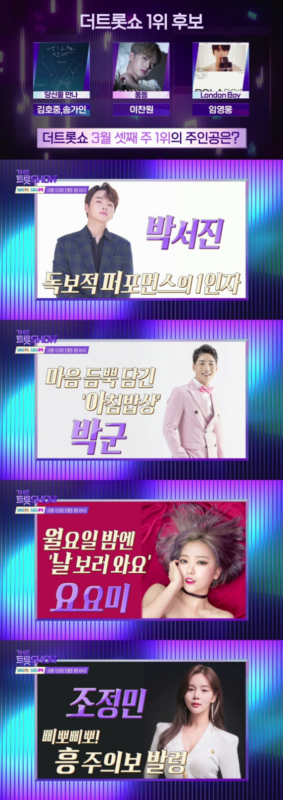 13일 오후 8시 생방송으로 펼쳐지는 SBS FiL과 SBS M '더 트롯쇼'에서는 지난주에 이어 이찬원, 임영웅, 김호중&송가인이 1위를 놓고 쟁쟁한 경합을 펼친다.