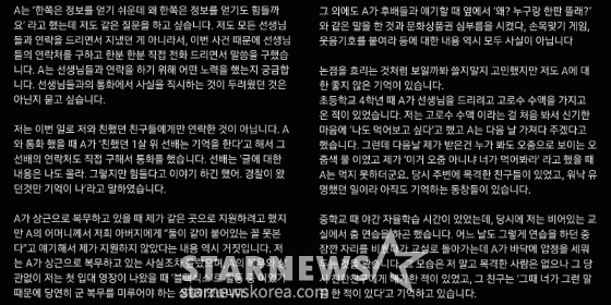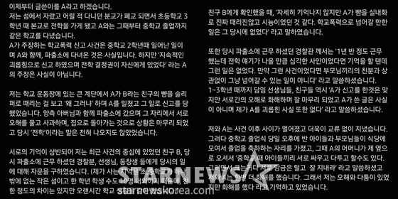 이어 "이 정도의 심각한 부상이라면 학교와 동네 모두 난리가 나고 크게 혼이 났어야 할 일이고, 상처가 낫는데 오래 걸렸을 텐데 가족, 동창들, 선생님들께 자문을 구했을 때도 저 사건에 대해 아는 사람은 아무도 없었습니다"라며 "기억이 안나는 것이 아닌 '없었던 일'입니다"라고 덧붙였다.