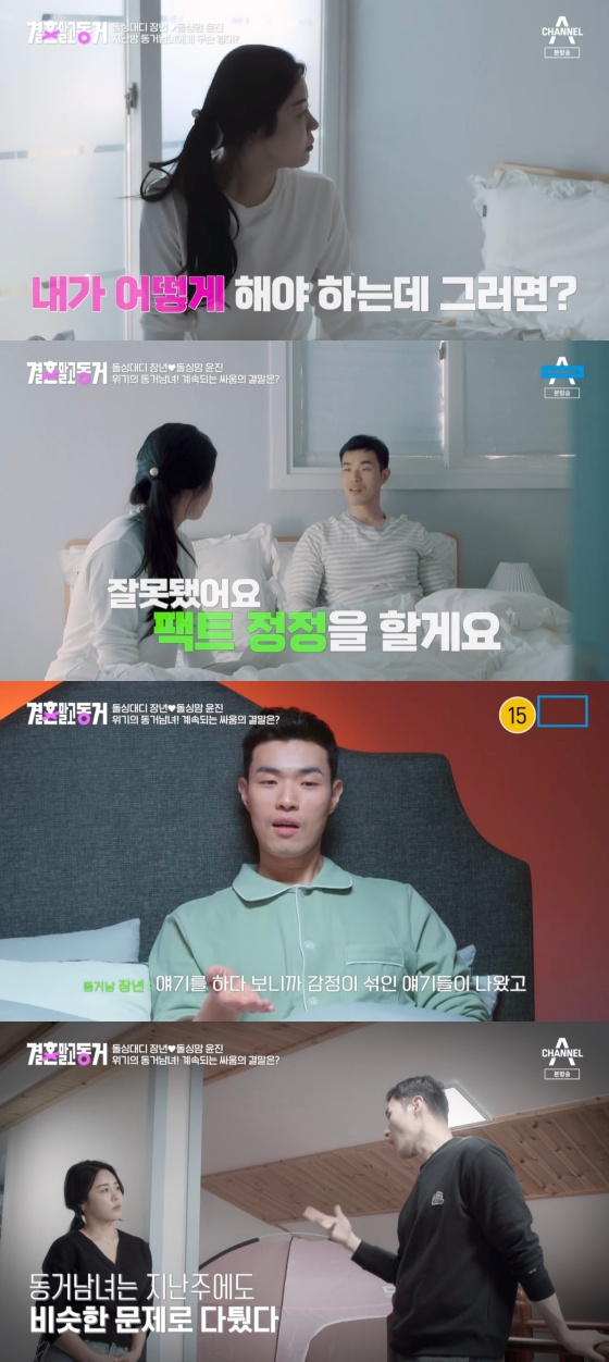 13일 오후 방송된 채널A 동거 관찰 러브스토리 '결혼 말고 동거'에는 '돌싱대디' 김장년과 '돌싱맘' 정윤진이 싸우는 모습이 담겼다.
