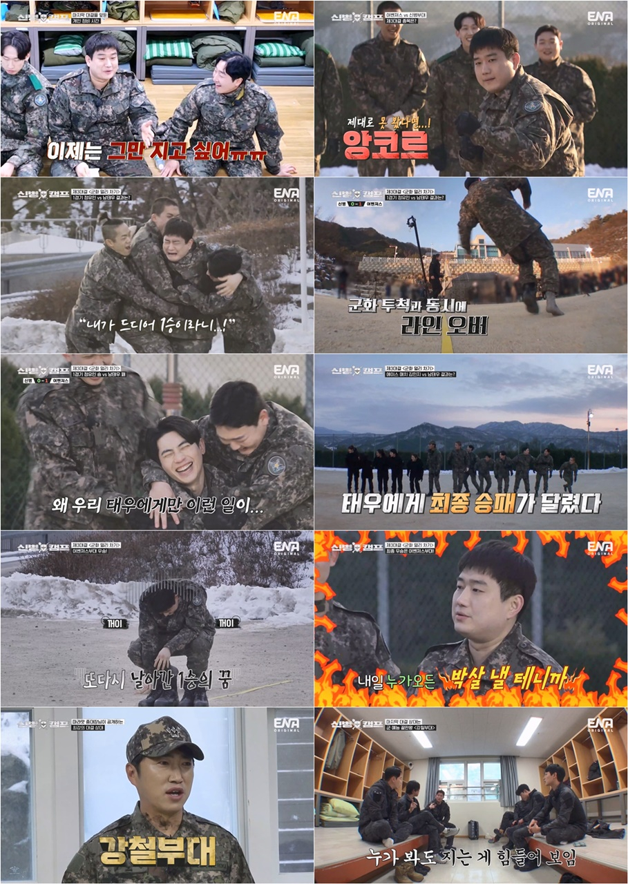 지난 13일에 방송된 ENA 예능프로그램 '신병캠프' 6회에서는 '신병즈' 차영남-이충구-김민호-이정현-남태우-전승훈-이상진-김현규가 각 분야 탑 티어 여성 부대원들로 구성된 프로젝트 부대 '여벤져스'와 박빙 승부를 펼친 뒤, 마지막 대결 상대인 '강철부대'를 맞이하는 모습이 그려졌다.
