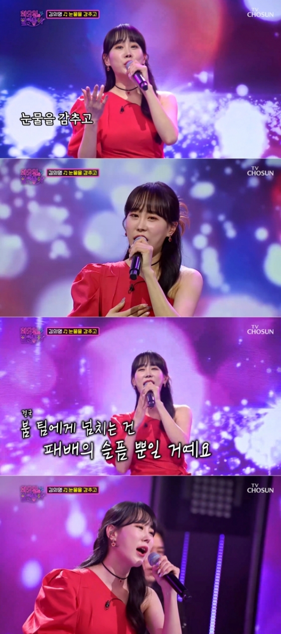 지난 14일 오후 방송된 TV조선 '화요일은 밤이 좋아'에서는 '미스터트롯2 끼갑부' 특집으로 황민우, 정민찬, 이찬성, 진웅, 강태풍, 최대성 총 6인의 특별 게스트가 출격한 가운데, 김의영은 황민우의 대결 상대로 나서며 애절한 감정선이 돋보이는 '눈물을 감추고' 무대를 꾸몄다.