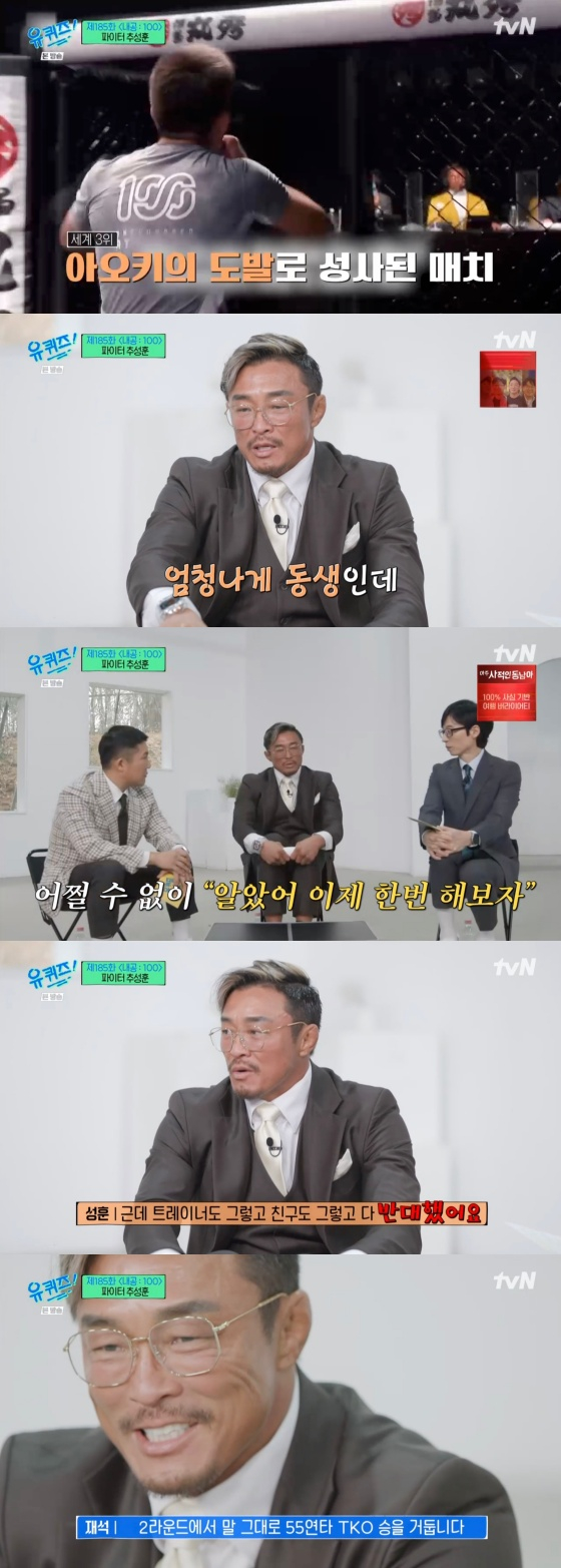 유재석은 추성훈에 "3년 만에 격투기 선수로 전향한 이유가 있냐"라고 물었다. 추성훈은 "계속 시합하고 싶었다"고 답했다. 유재석은 격투기 선수 활동 20년 차인 추성훈에 최고의 인생 경기에 대해 물었고, 추성훈은 "데뷔 경기랑 최근 아오키 선수와의 경기가 가장 기억에 남는다"고 답했다.