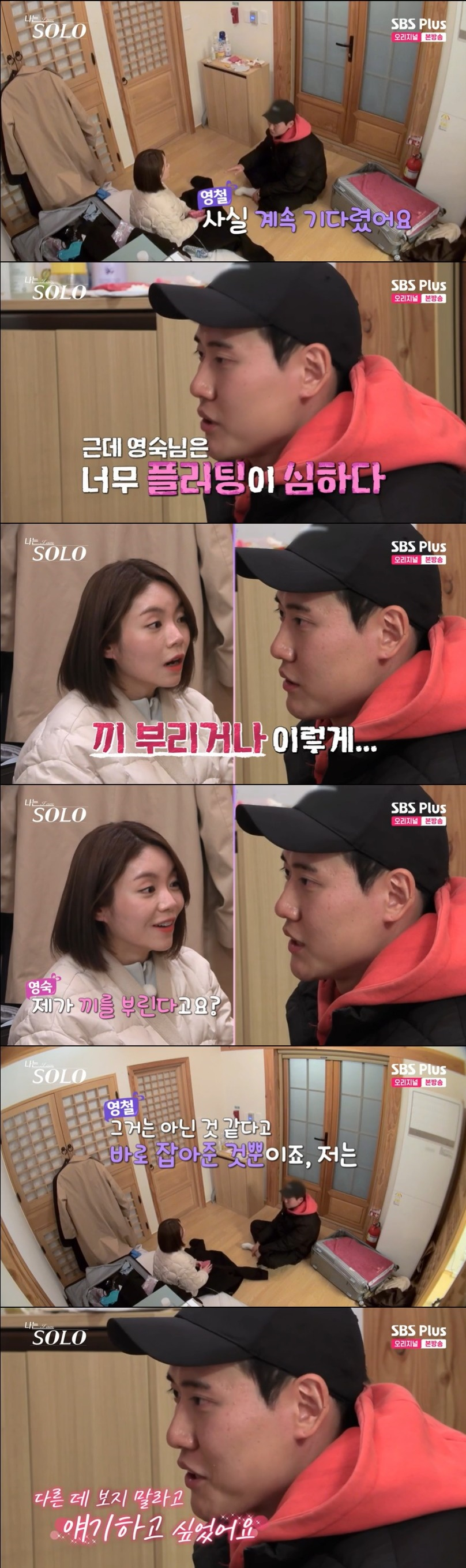 이를 들은 영숙은 깜짝 놀라며 "제가요? 제가 끼를 부린다고요?"라고 말했다. 이에 영철은 "저를 '일름보'라고 욕할 것 같은데, 어쨌든 저는 영숙 님의 호감을 얻고 싶으니까. '형, 영숙님이 아무한테나 그러는 건 아닌 것 같다'라고 바로잡아줬다"라고 말했다.