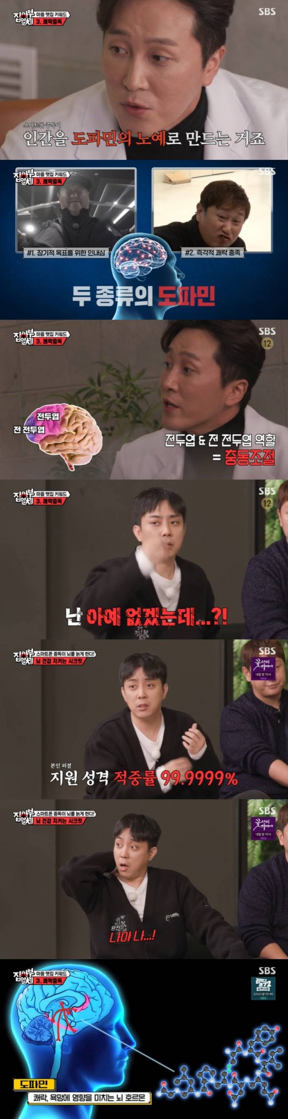 이날 양재웅은 '쾌락중독'에 빠져드는 이유를 설명했다. 양재웅은 "스마트폰을 쓰는 것 자체가 도파민을 계속해서 분비하는 것"이라며 "전두엽이 충동조절을 한다. 계획과 실행을 담당하는데, 스마프폰에 오랫동안 중독된 사람들은 전두엽의 기능을 잘 못 하게 되는 거다"라고 말했다.