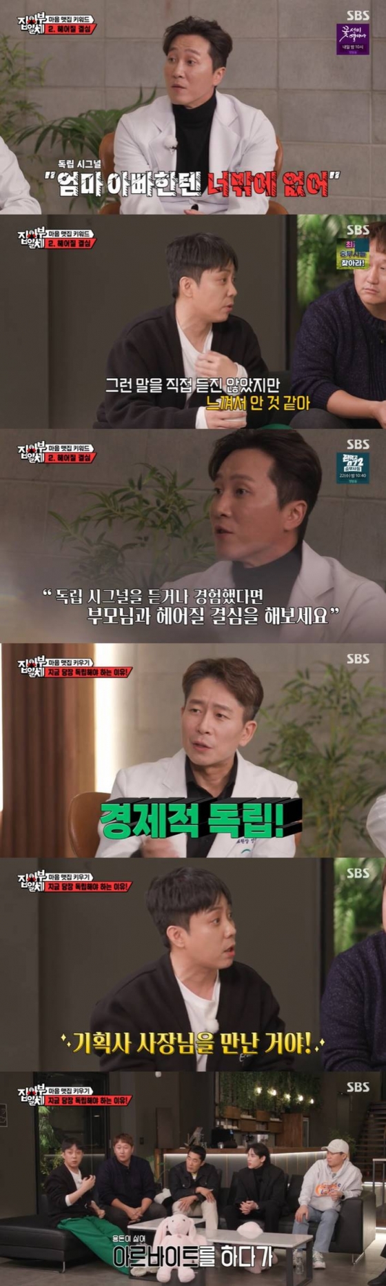 양재진, 양재웅은 자신의 정신 건강을 위해 부모와 헤어질 결심도 할 줄 알아야 한다며 "경제적 독립을 먼저 해야 정신적, 신체적 독립이 가능하다. 20대 때 취업을 해서 돈을 버는 게 가장 중요한 숙제"라고 말해 눈길을 끌었다.