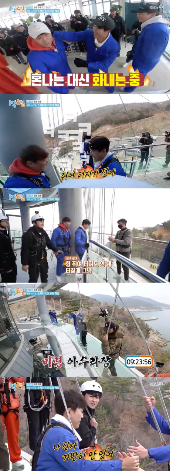 이날 제작진은 스카이워크에서 3가지 포즈를 취하는 '의리 게임'을 준비해 멤버들을 기겁케 했다. 김종민은 차라리 실패하겠다며 OB팀에 "100만 원 주겠다"고 애원했으나 문세윤은 "나도 쫄보다"고 맞서 긴장감을 높였다.