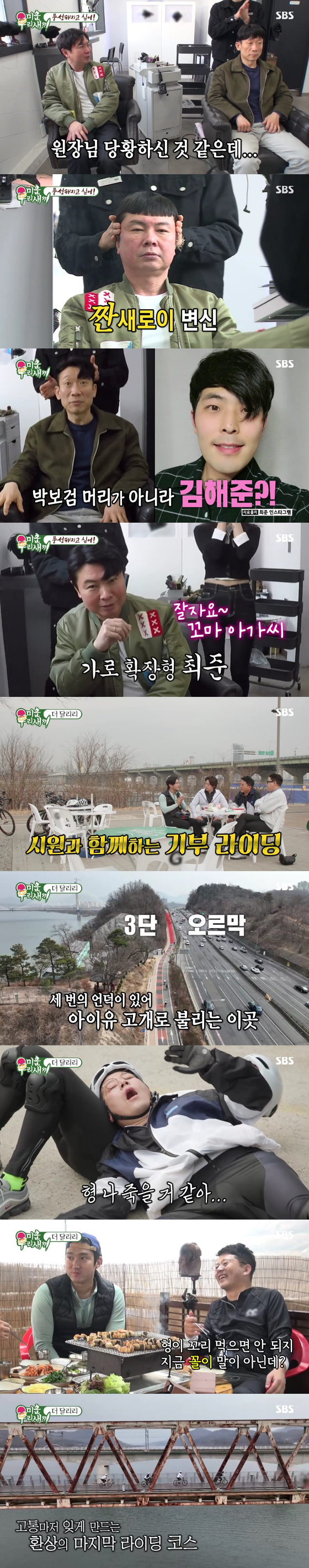 일행은 세 번의 언덕이 있는 아이유 고개에서 극한 시련이 왔으나 최시원은 '혼자면 할 수 없다. 함께여서 할 수 있다"며 형들을 독려하며 끝까지 리드했다. 이어 장어구이를 먹으며 체력 보충을 했는데, 김준호가 혼자 장어 꼬리를 다 먹자 이상민이 분노했다. 이에 김준호는 "형이 꼬리 먹으면 안되지? 꼴이 말이 아닌데"라며 너스레를 떨어 웃음을 안겼다. 결국, 네 사람은 여러 고비를 넘기며 끝까지 포기하지 않는 모습으로 목표한 기부 라이딩에 성공했다.
