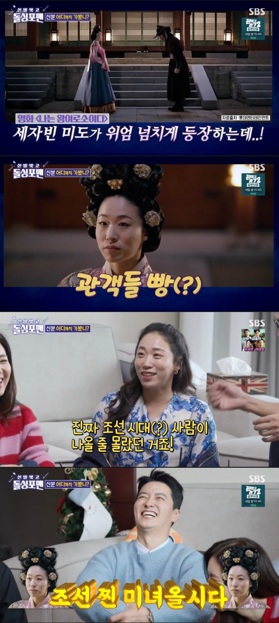 이날 이미도는 "'나는 왕이로소이다'에서 세자빈 역할을 했던 적이 있다"며 "저 멀리서 궁녀들 데리고 세자빈이 당당하게 들어오는데 클로즈업되는 순간 관객들이 웃었다"고 말했다. 이에 MC 임원희가 "여왕스럽고 그런 것만 보다 진짜 조선 미녀가 나오니까"라며 말을 더듬었다.