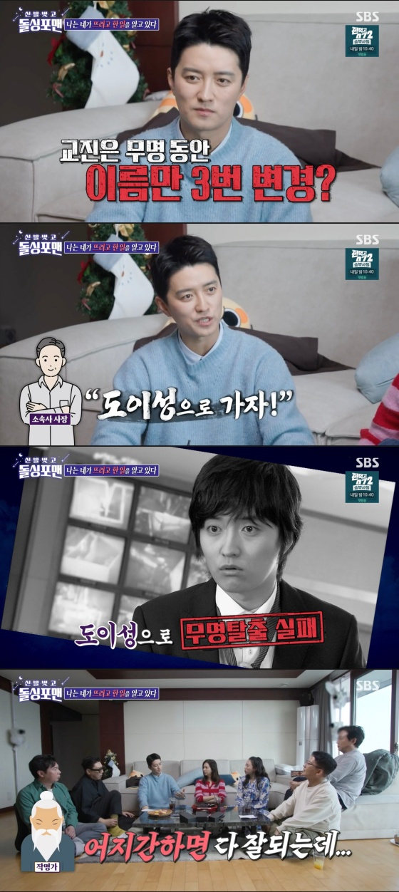 인교진은 "사장님이 '무협 느낌 나게 도이성으로 가자'라고 했다. 근데 그게 안 됐다. 이후 사장님이 '두 번째 이름으로 가자'라고 해서 성이준으로 했다. 성이준이 짧게 끝났고 다시 인교진으로 돌아왔다"고 말했다. 인교진은 "다 그 작명소에서 하는데 이름 지어주신 분이 '어지간하면 내가 이름 지어주면 다 잘 되는데 얘처럼 안되는 애는'이라고 했다"고 말해 씁쓸함을 안겼다.