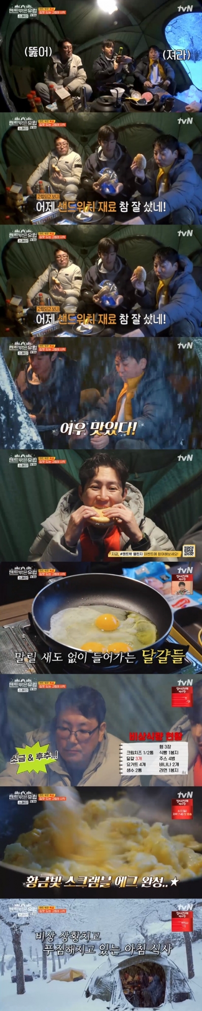 뜨거운 커피를 내리고 간단히 샌드위치를 만들어 먹은 가운데, 조진웅이 비상식량 계란으로 스크럼블 에그를 만드는 등 의외로 풍족한 아침 식사를 즐겼다.