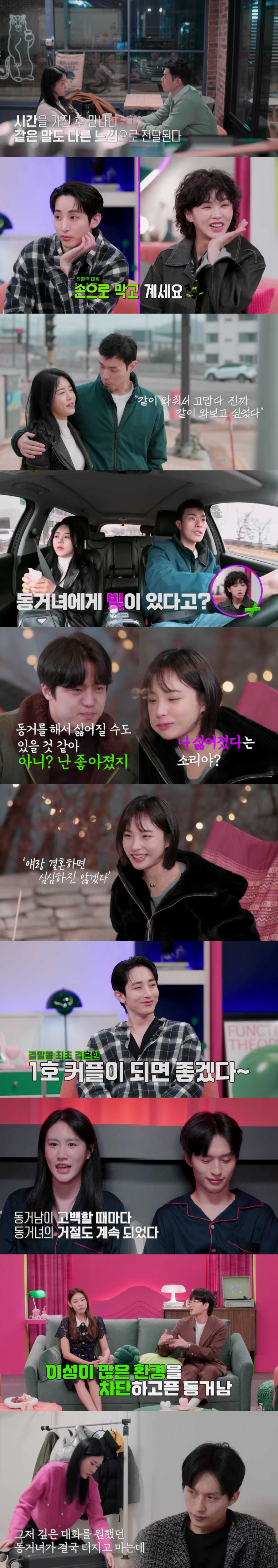 이후 초보 동거 커플 최준석과 정세미의 알콩달콩한 하루가 시작됐다. 정세미는 자신이 쓴 시나리오와 관련해 영화 제작사와 얘기를 나누며 바쁜 하루를 보냈다. 그런 가운데, 벌써 3개월이 지나 계약 연장을 확인하는 집주인의 전화가 걸려 왔다. 이에 정세미는 "동거를 어떻게 할 건지에 대해서 진지한 대화를 할 순간이 왔다"며 최준석과 깊은 대화를 위해 도심 속 글램핑 데이트를 준비했다. 정세미는 동거 이후 명절에 찾아간 본가에서 냉정한 시선들을 받았다고 고백했고, 최준석도 "우려의 목소리를 많이 들었다"고 공감했다. 하지만 정세미는 "나는 동거 잘했다고 생각해. 적어도 얘랑 결혼하면 심심하진 않겠다. 불행하진 않겠다고 생각했다"며 최준석에게 3개월간의 동거 생활에 대한 소감을 밝혔다. 긍정적인 결혼 이야기에 MC들도 환호했다.