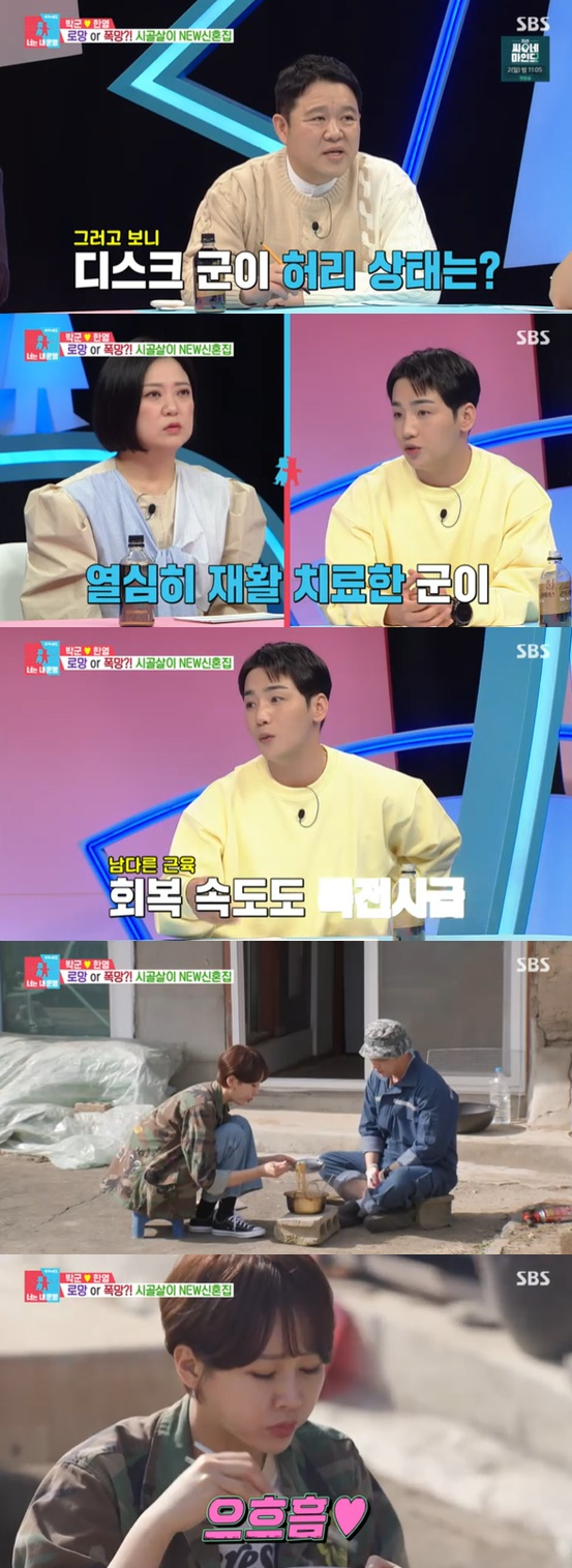 그러자 박군은 "허리 괜찮다. 디스크 수술도 잘 됐다고 하고 재활도 잘 했다. 제가 다른 사람에 비해 허리 근육도 있고 해서 회복 속도가 빨랐다"라고 말해 안심 시켰다.