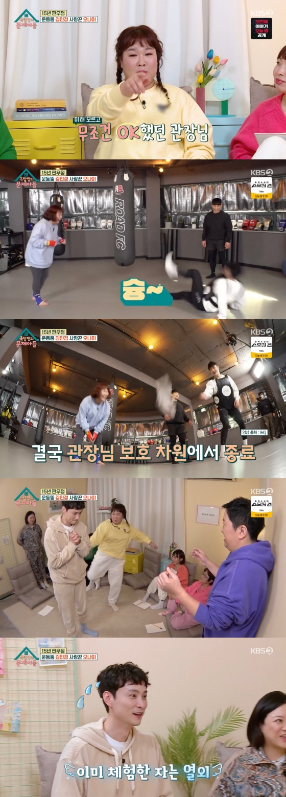 이날 김민경이 자신의 힘을 과시했다. 김민경은 "전에 관장님이 한번 킥을 차보라고 해서 앞에 서계셔서 찼는데 그분이 날라갔다"고 말해 웃음을 안겼다. 이에 MC 정형돈이 MC 김종국, MC 민경훈에 "우리 가위바위보 해서 진 사람이 엉덩이 한번 맞아보자"라고 제안했다.