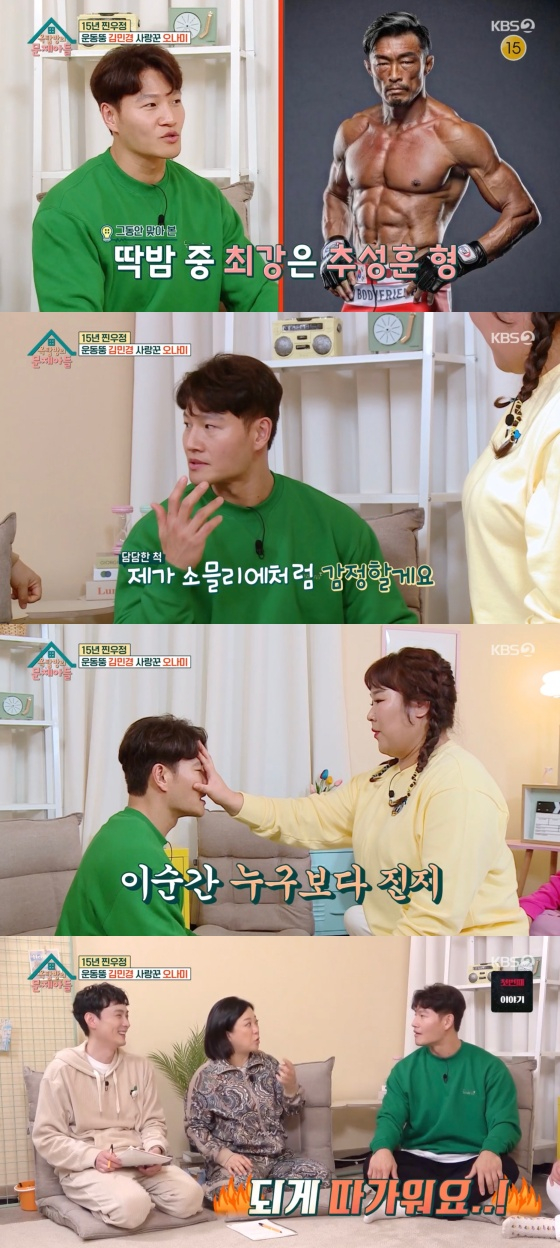 김민경은 "민상 선배가 김종국에 딱밤을 맞았다더라. 그런데 저한테 와서 '네가 더 세'했다"고 말했다. 이어 "민상 선배가 비염이 있는데 제가 뚫어줬다"고 말해 폭소를 유발했다. 김민경은 발차기보다 딱밤이 더 세다고 알렸다.