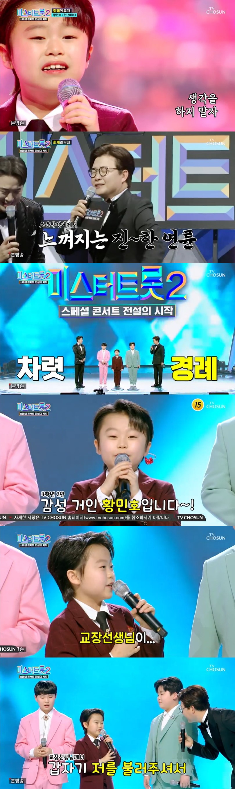 황민호는 화제를 모았던 '천년바위'노래로 무대를 펼쳤다. 무대 후 MC 김성주는 "작은 거인 황민호 군. 열 살짜리가 너무 절절하게 부르니까"라며 감탄했다. MC 붐도 "저도 민호 군 보면 두 번 놀라요. 라이브에 놀라고 너무 작아서 또 놀라고. 근데 거기서 나오는 에너지가 인생 두 번 산 것 같아요"라며 놀라워했다.