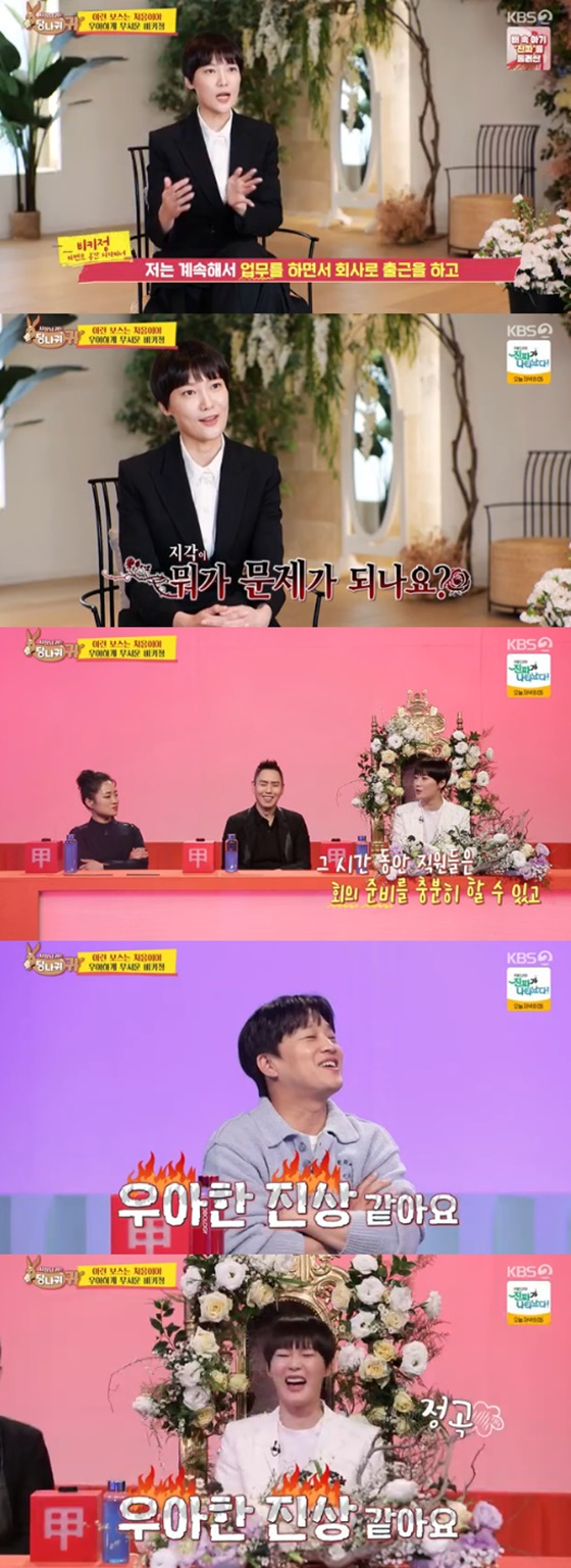 또한 비키정은 "미리 (지각할 것 같다고) 얘기해 주면 되지 않냐"는 물음에 "그 시간 동안 직원들이 회의 준비를 할 시간을 주는 거다"라고 답변했다. 이를 들은 차태현은 "우아한 진상 같다"고 말했다.