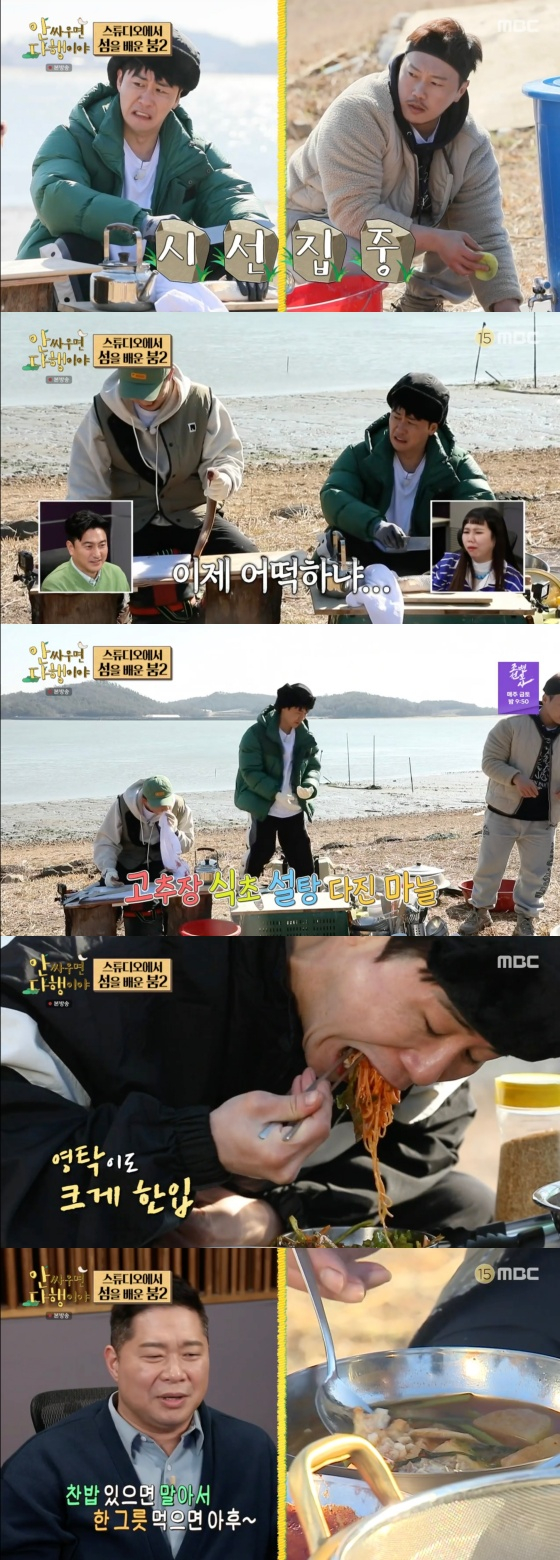 이후 셋은 잡은 해산물을 어떻게 요리할지 이야기했다. 붐은 "소라는 무조건 구워야 해"라고 제안했다. 송진우는 잡았던 해삼을 찾았지만 내장만 남은 해삼을 발견하고 "장어가 내장 빼고 다 먹었어"라며 아쉬워했다.
