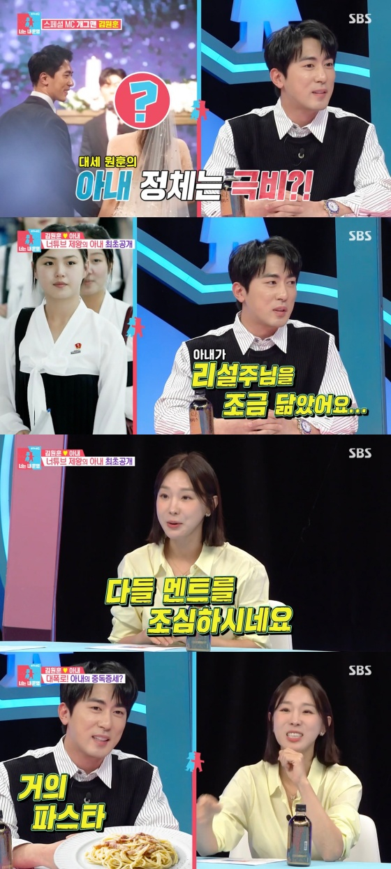 이날 MC 서장훈은 "아내분에 대해 공개하겠다고"라고 물었다. 김원훈은 "지금 와이프가 30살이다. 어린이 뮤지컬 강사를 하고 있다. 제가 대학교 뮤지컬 전공했다. CC로 만나서 그때부터 8년 정도 연애를 하다가 결혼했다"고 전했다. 이지혜는 "외모가 너무 궁금하다 "이런 말씀드리기 조금 그렇지만 리설주 님을 닮았다"고 말해 모두가 조용했다. 이지혜는 "다들 멘트를 조심하시네요"라고 말해 웃음을 자아냈다.